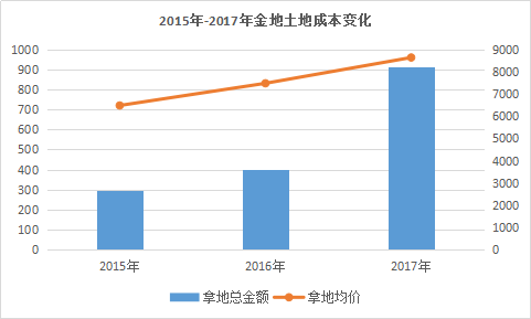 不過,隨著一二線城市土地溢價逐漸攀高,重倉一二線戰(zhàn)略使得金地拿地成本有所增加。2015年至2017年,金地拿地成本分別為6487元/平方米、7486元/平方米、8648元/平方米。