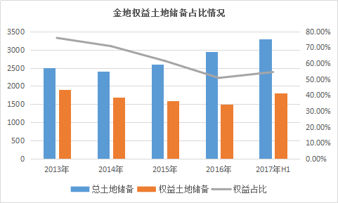 截止2017年6月30日,金地已布局37個城市,總土地儲備約3300萬平方米,權(quán)益土地儲備約1800萬平方米。