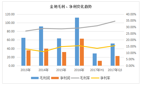 受益于一二線戰(zhàn)略布局調(diào)整及不斷優(yōu)化的產(chǎn)品結(jié)構(gòu),金地近年來毛利率保持著增長狀態(tài)。截至2017年第三季度末,金地錄得毛利52.3億元,毛利率從2016年末的29.27%提升至34.57%;凈利潤則與2016年末持平,均為15.5%,歸屬上市公司凈利潤22.60億元。