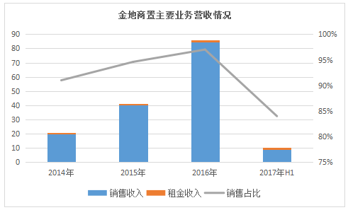 2017年中期,因來自大連匯泉、西安藝華年及上海山水四季城銷售確認收入減少,金地商置物業(yè)銷售收入大幅減少,但物業(yè)銷售占比仍高達84%,商業(yè)平臺屬性還不明顯。
