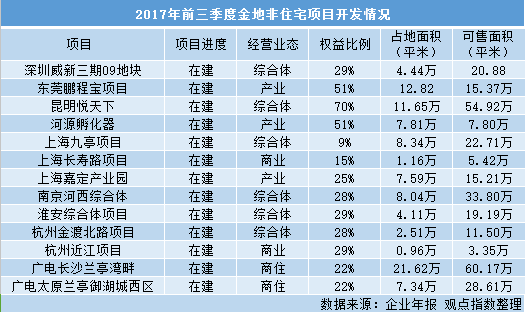 具體項目上,金地有意識加大對商業(yè)地產(chǎn)的投資。從公告披露的數(shù)據(jù)來看,2017年前三季度,金地在建及竣工的房地產(chǎn)項目共109個,其中非住宅項目(綜合體、產(chǎn)業(yè)、商業(yè)、商住項目)共計13個,占比11.93%。