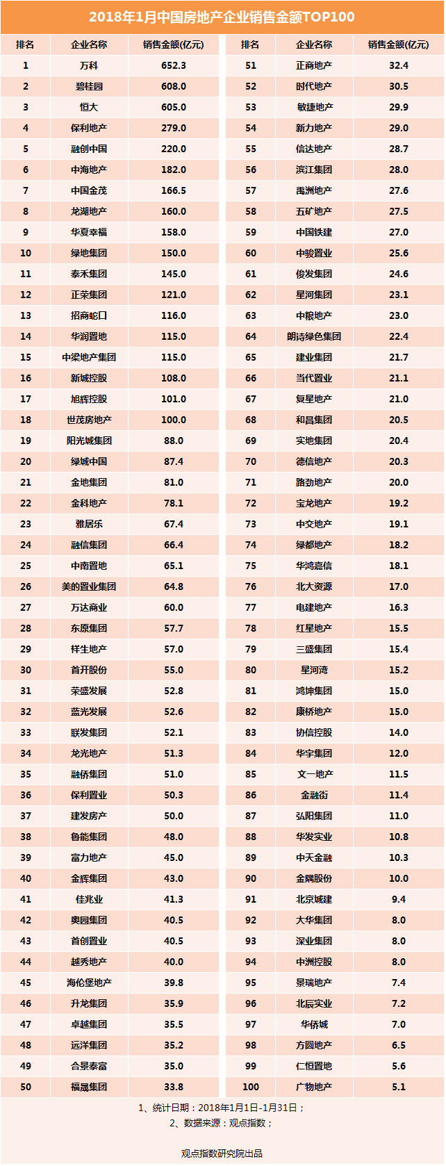 2017年獨(dú)領(lǐng)風(fēng)騷的碧桂園則以608億元跌至第二位,恒大1月憑借605億元的銷售額緊隨其后。