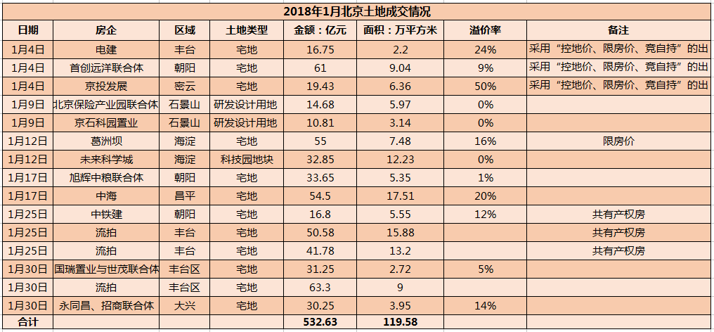 以北京為例,開年首月北京累計(jì)有15宗地塊推出市場(chǎng)進(jìn)行拍賣,土地面積合約119.58萬(wàn)平方米,成交金額(含流拍)532.63億元。相比2017年25%的平均溢價(jià)率,2018年北京土地溢價(jià)率平均只有12%。