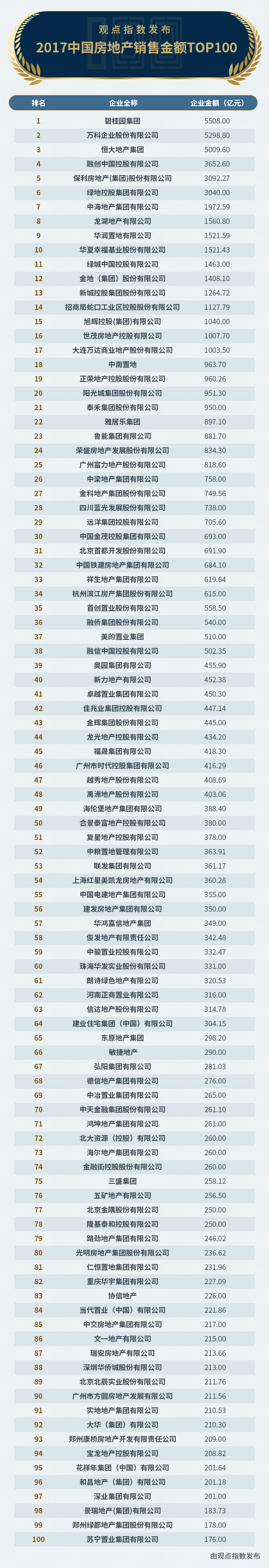 觀點(diǎn)指數(shù)·2017中國房地產(chǎn)企業(yè)銷售金額TOP100榜入榜100家企業(yè),全部均已達(dá)標(biāo)百億,最低金額超過170億。