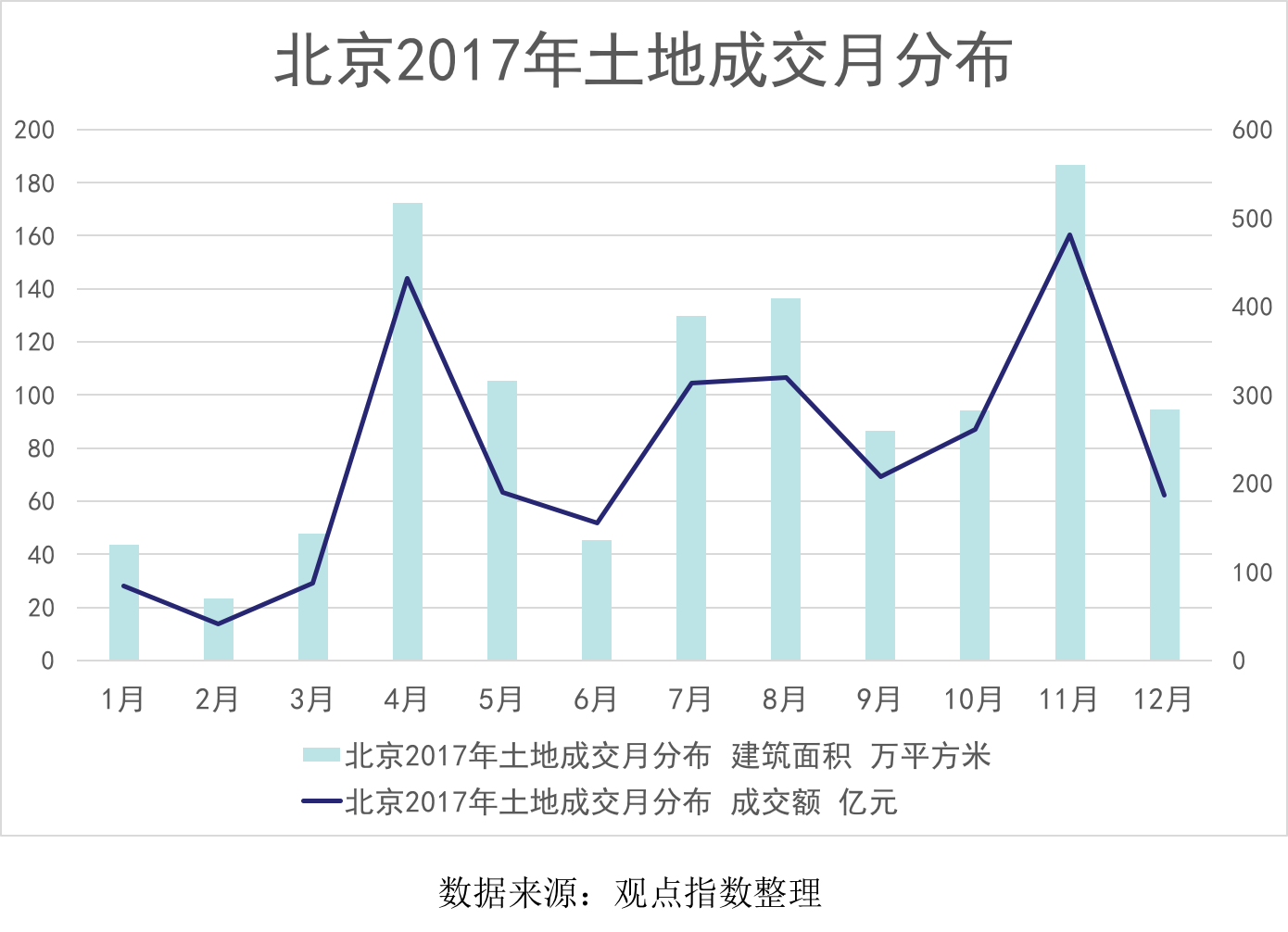 據(jù)觀點(diǎn)指數(shù)統(tǒng)計(jì),北京2017年共成交102宗地塊,總建設(shè)用地面積793.55萬平方米,提供總建筑規(guī)模達(dá)1380.26萬平方米。非工業(yè)用地總成交額為2758.4億元,主要集中于4月及11月成交,成交金額均超過了400億元。