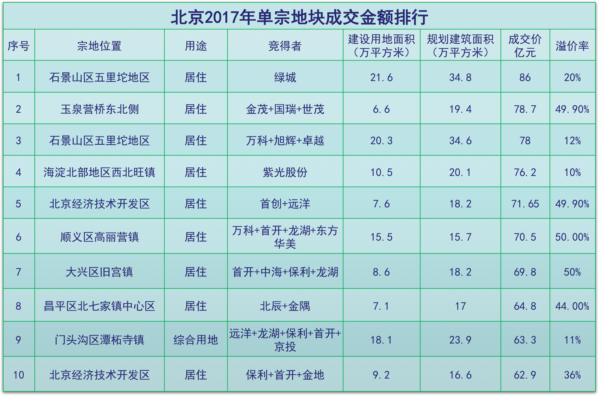 本年度起始價(jià)最高同時(shí)也是最高成交價(jià)的地塊由綠城競(jìng)得,成交價(jià)86億元,這個(gè)價(jià)格也是北京歷史成交價(jià)次位。