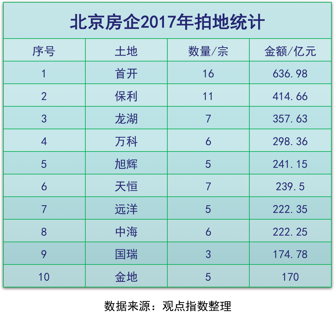這在一定程度上也說明,土地出讓規(guī)則依然無法阻止開發(fā)商拿地的熱情。統(tǒng)計(jì)數(shù)據(jù)顯示,2017年拿地金額前十的開發(fā)商中,國企占比明顯增加,包括中海、中房、保利、金茂、人居置業(yè)等均加入搶地。其中,中海拿地3宗,土地面積551畝,投資總額高達(dá)96.15億元排名房企第一。