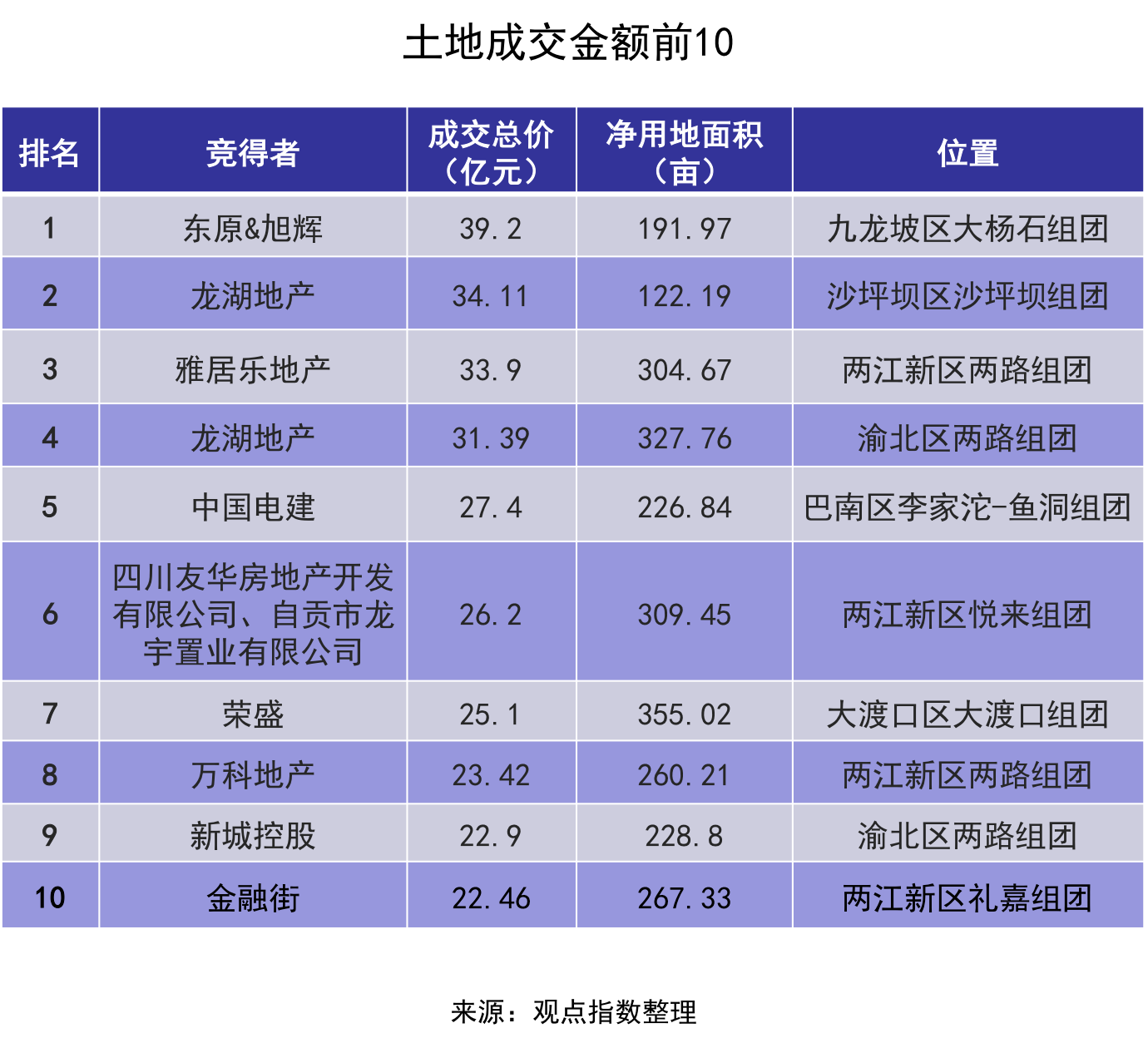 具體土地成交價(jià)方面,由東原+旭輝、龍湖以及雅居樂分別以39.2億元、34.11億元、33.9億元分別在土地?cái)?shù)據(jù)來源:觀點(diǎn)指數(shù)整理成交總價(jià)排名前三。
