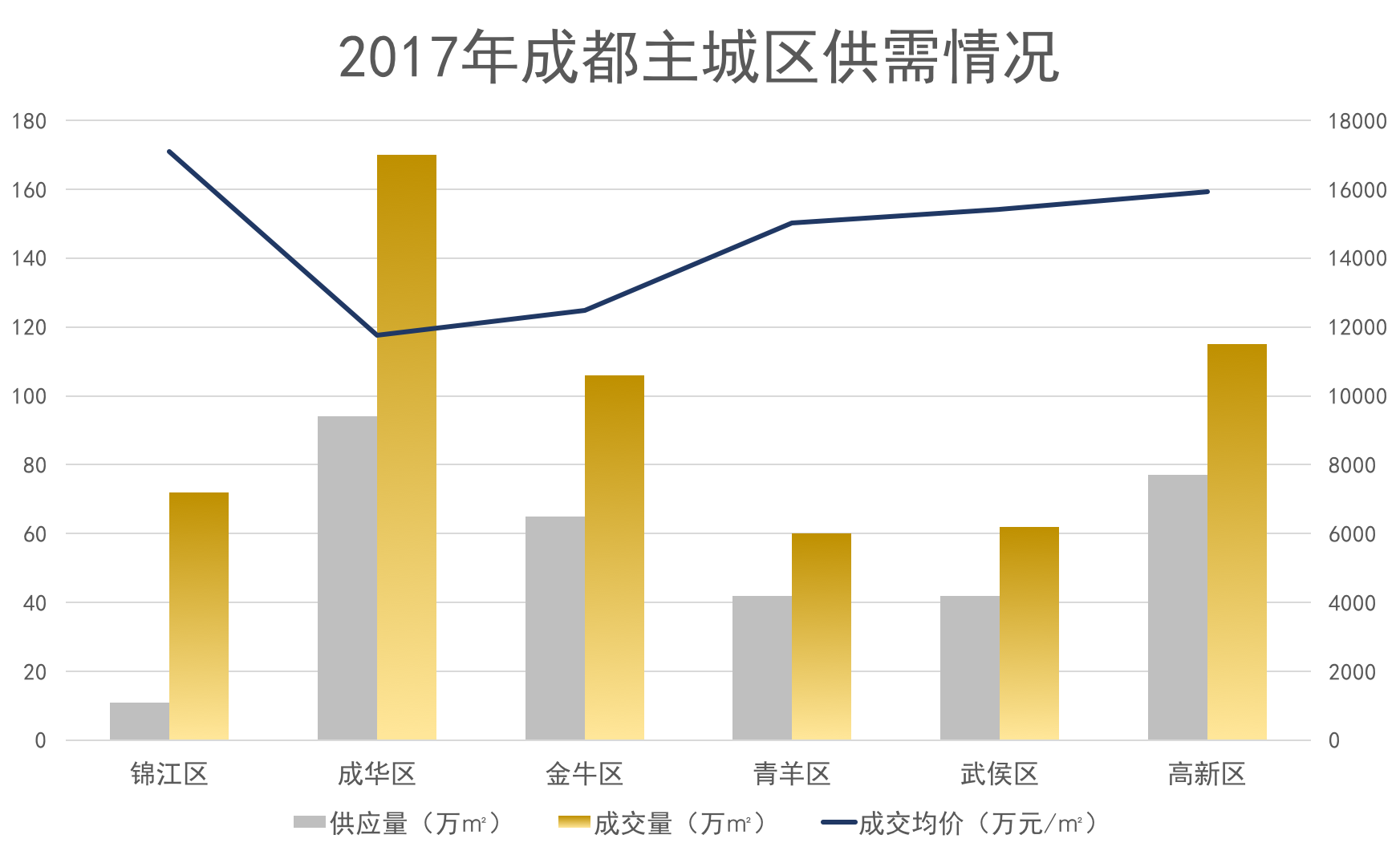 在此情況下,2017年成都房地產(chǎn)市場(chǎng)供銷數(shù)據(jù)全線下跌,總體供應(yīng)量均創(chuàng)下近年來新低。