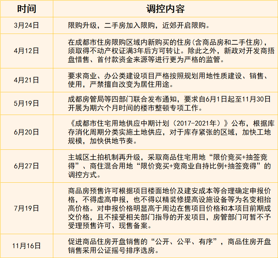 在“房住不炒”的主基調(diào)下,2017年成都同樣出臺(tái)了一系列樓市調(diào)控措施,政策持續(xù)高壓,被市場(chǎng)稱為“史上最嚴(yán)調(diào)控期”。