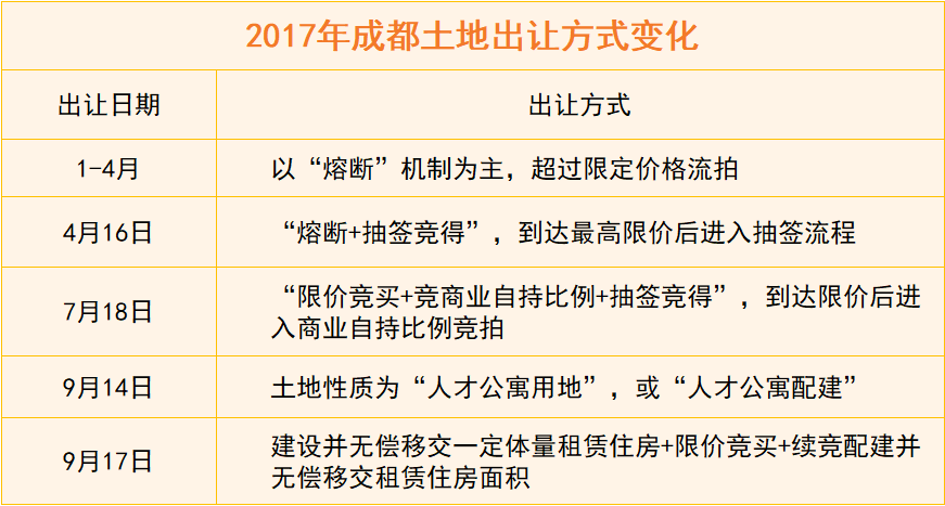 按出讓方式分,2017年成都土地招拍掛先后探索過5種不同方式,基本圍繞限價(jià)、競(jìng)配建、競(jìng)自持商業(yè)或租賃面積等。