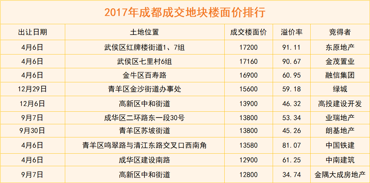 隨著土地出讓規(guī)則的逐步完善,成都土拍價(jià)格開始受到控制。以去年全市成交樓面價(jià)前十為例,有一半均在采用“熔斷+抽簽競(jìng)得”規(guī)則出臺(tái)前出現(xiàn)。