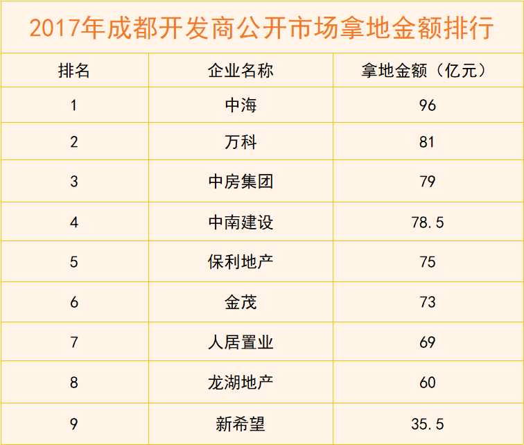 從投資力度分析,上述綜合實(shí)力排名前列的開發(fā)商基本具備資金充裕、可售房源相對(duì)充足等特征。以2017年為例,萬科在公開市場(chǎng)獲得9宗地僅次于人居置業(yè),投入金額81億元僅次于中海;萬科于10月還宣布投資2000億元在蓉開展產(chǎn)業(yè)新城建設(shè)。保利、龍湖也分別斥資75億元、60億元補(bǔ)充土地儲(chǔ)備。