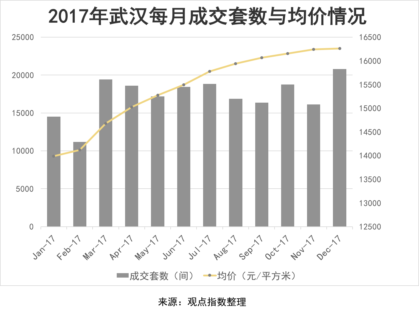 由于處于賣方市場(chǎng),去年武漢市整體價(jià)格呈現(xiàn)上漲的態(tài)勢(shì),由1月份約13986元/平方米升至年底12月約16259元/平方米。