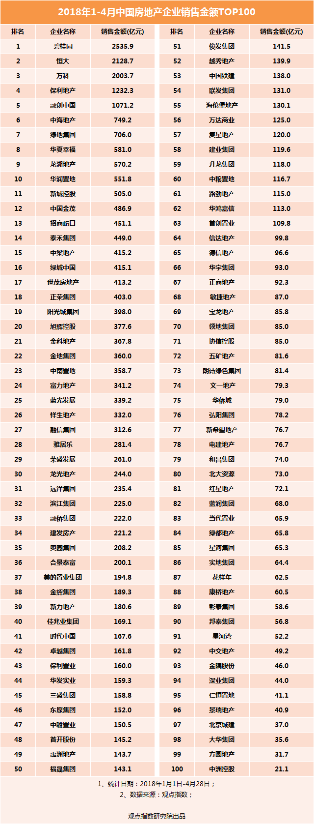 緊隨其后的TOP5房企銷售規(guī)模已經(jīng)達(dá)到千億,同比上年增長超過30%,考慮供貨后置的傳統(tǒng)習(xí)慣,這意味著要想在前五扎穩(wěn)腳跟,全年銷售至少要達(dá)到3500億元。對(duì)比2017年的420.5億元,2018年前4個(gè)月的TOP10門檻值也已經(jīng)超過500億元。綜合來看,前十的增長速度基本一致,保持在36%左右的水平。