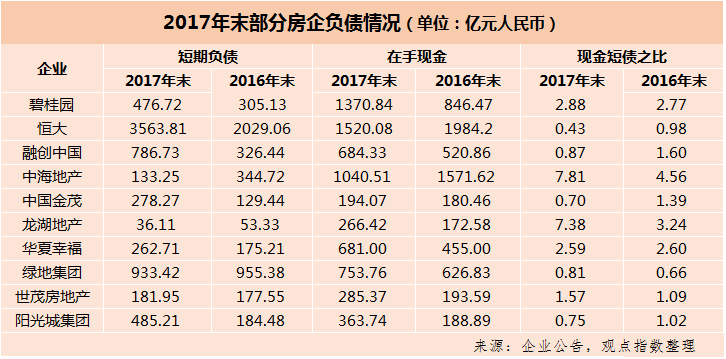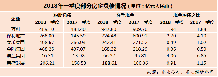 回到比較具象的現(xiàn)實(shí),截止2018年一季度,部分房企的現(xiàn)金短債之比均發(fā)生了比較大的下降。具體表現(xiàn)為在手現(xiàn)金較去年同期微增甚至是減少,而與之對(duì)應(yīng)的卻是短期負(fù)債的持續(xù)上升。受此影響,大部分房企的現(xiàn)金負(fù)債之比由原來的大于1,演變?yōu)楝F(xiàn)金已不能完全覆蓋負(fù)債,存在一定的債務(wù)償還壓力。
