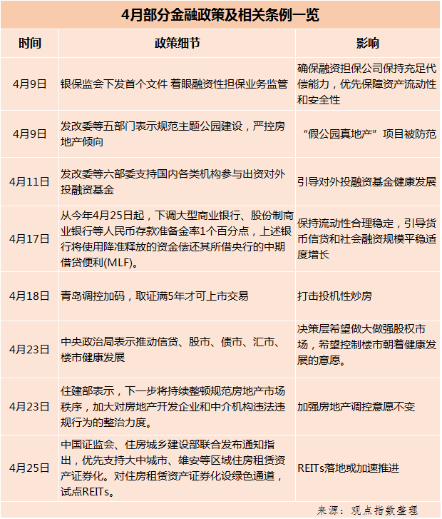 雖然住房租賃項(xiàng)目融資得到政策的利好,不過基金、信托、債券發(fā)行等方面金融監(jiān)管則是調(diào)控力度不變。4月,發(fā)改委等六部委支持國內(nèi)各類機(jī)構(gòu)參與出資對(duì)外投融資基金。同時(shí),從今年4月25日起,央行決定下調(diào)部分金融機(jī)構(gòu)存款準(zhǔn)備金率1個(gè)百分點(diǎn)。