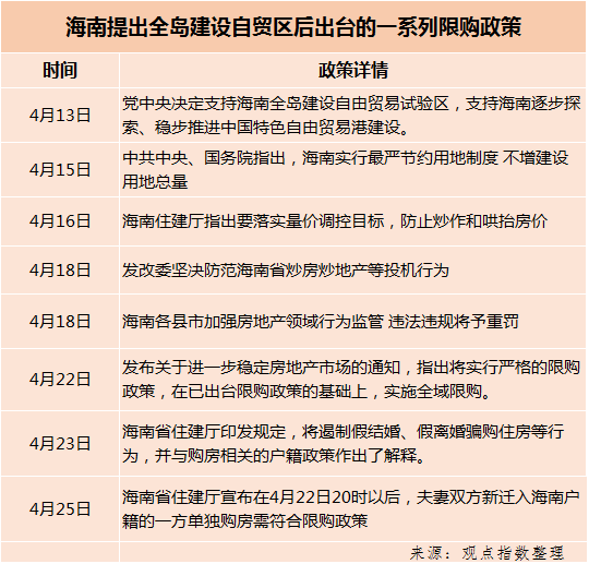 據(jù)觀點(diǎn)指數(shù)監(jiān)測的數(shù)據(jù)顯示,提出建設(shè)自貿(mào)區(qū)開始,海南合約發(fā)布了7條限購政策。當(dāng)中包括實(shí)行最嚴(yán)節(jié)約用地制度,不增建設(shè)用地總量;在已出臺(tái)限購政策的基礎(chǔ)上,實(shí)施全域限購;甚至對(duì)假結(jié)婚、假離婚騙購住房等行為,與購房相關(guān)的戶籍政策作出了解釋。