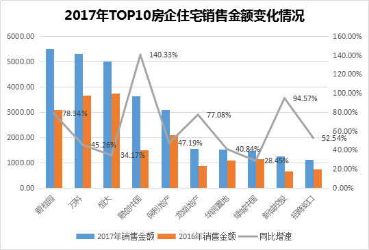 觀點(diǎn)指數(shù)統(tǒng)計(jì)的數(shù)據(jù)顯示,僅從TOP10房企來看,過去的2017年中超過半數(shù)的銷售金額錄得至少50%的增長。
