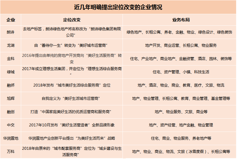 為了維持業(yè)績的繼續(xù)增長,就需要在住宅或者地產(chǎn)之外需求更多的可能,因此基于美好生活下的新業(yè)務(wù)成為不少房企培育新增長點(diǎn)的方向。與之相應(yīng),已經(jīng)有不少房企順勢而為,提出盡可能覆蓋更多城市服務(wù)功能的定位,如朗詩去掉地產(chǎn)標(biāo)簽,將名稱由原來的“朗詩綠色地產(chǎn)”改為“朗詩綠色集團(tuán)有限公司”,布局長租公寓、養(yǎng)老、金融、物業(yè)等業(yè)務(wù);融創(chuàng)則提出要做“美好生活運(yùn)營商”;龍湖由“善待你一生”升級為“美好城市運(yùn)營商”;旭輝自我定位為“美好生活城市運(yùn)營商”……