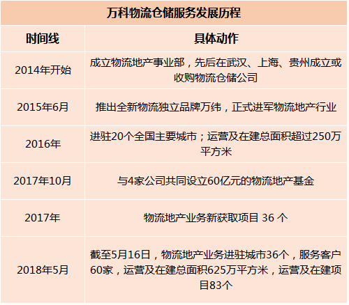 從萬科物流地產(chǎn)的發(fā)展軌跡來看,其對物流地產(chǎn)的布局最早始于2014年,彼時(shí)其成立物流地產(chǎn)事業(yè)部,先后進(jìn)駐廊坊、貴陽武漢和上海,成立或收購物流倉儲公司。并稱要學(xué)習(xí)普洛斯,甚至請過普洛斯的專家到其總部給員工上課;2015年6月萬科撤銷物流地產(chǎn)事業(yè)部,推出全新的物流品牌萬緯,宣布正式進(jìn)軍物流地產(chǎn)行業(yè)。