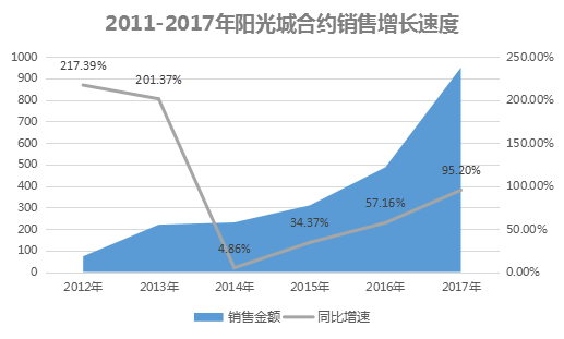 回顧過往,陽光城的發(fā)展階段約莫可以分為三大階段:一個(gè)是銷售業(yè)績(jī)僅為兩位數(shù)的沉寂階段,即2012年以前;第二個(gè)是實(shí)現(xiàn)近10倍高速增長(zhǎng)的2012年-2014年;接著是進(jìn)入相對(duì)穩(wěn)定的中高速發(fā)展時(shí)期,2015年-2016年,在3年的時(shí)間里陽光城的銷售金額已經(jīng)來到近500億元。