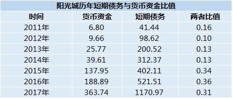 不過,正如朱榮斌所言,進(jìn)擊的陽光城就好比“天天大吃大喝”,最后想要沒有三高,是很難做的。觀點(diǎn)指數(shù)研究發(fā)現(xiàn),對(duì)比過去的2011-2014年,雖然2017年陽光城貨幣現(xiàn)金對(duì)短期負(fù)債的覆蓋率有所提升,為0.31,但是和過往兩年相比還是有所下降。