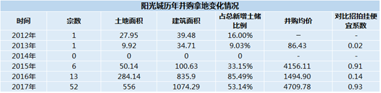 而“雙斌”給陽光城的并購動(dòng)作卻顯得更為堅(jiān)決一些:2017年,陽光城拿地金額為1396.37億元,剔除合作以及補(bǔ)容積率的項(xiàng)目外,用于并購的金額為505.97億元,超過招拍掛市場(chǎng)的480.45億元。