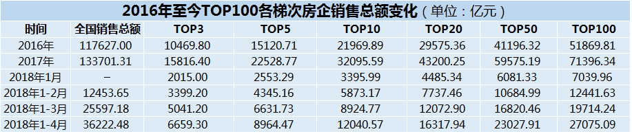 從數(shù)據(jù)端看來,上述特征更加清晰。從2016年至今,TOP100各梯次的銷售總額均錄得較大增長。其中,TOP3的銷售總額由2016年的10469.8億元上漲至2017年的15816.4億元,上漲幅度超過51%。