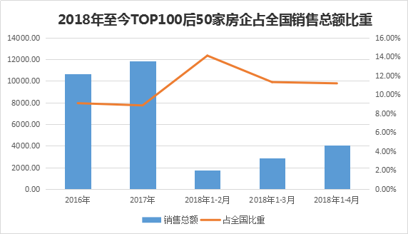 反觀TOP51-TOP100的50家房企,2018年1月的銷售總額為958.63億元,累計前四月的銷售總額為4047.18億元。50家房企的銷售總額還落后前三強(qiáng)幾千億元。
