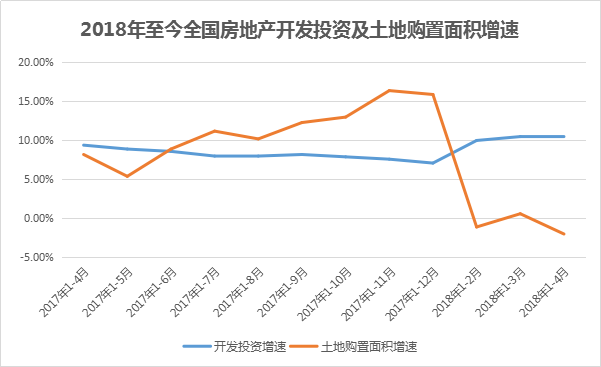 從國家統(tǒng)計局發(fā)布的數(shù)據(jù)來看,和2017年房地產(chǎn)行業(yè)土地購置面積同比增速均為正數(shù)或者雙位數(shù)增長不同,進(jìn)入2018年該數(shù)值已經(jīng)轉(zhuǎn)為負(fù)數(shù),其中2018年1-2月累計的土地購置面積增速為-1.2%,1-3月份增長速度為0.5%。不過僅一個月后就又轉(zhuǎn)為負(fù)數(shù),1-4月份房地產(chǎn)開發(fā)企業(yè)土地購置面積5412萬平方米,同比下降2.1%。