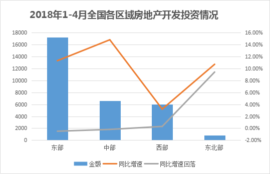 其中東部地區(qū)房地產(chǎn)開發(fā)投資17181億元,同比增長11.3%,增速比1-3月份回落0.5個百分點;中部地區(qū)投資6604億元,增長14.8%,增速回落0.2個百分點;西部地區(qū)投資5980億元,增長3.2%,增速提高0.3個百分點;東北地區(qū)投資827億元,增長10.7%,增速提高9.4個百分點。