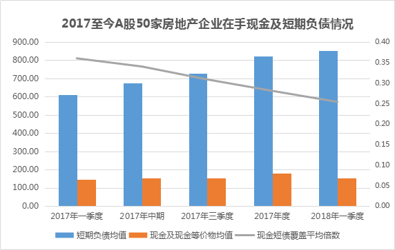 分季度來觀察,2017年一季度50家A股企業(yè)的短期負(fù)債均值為611.27億元,爾后該數(shù)值逐季上升,分別為676.34億元、727.83億元、823.13億元,至2018年一季度已經(jīng)來到853.77億元。