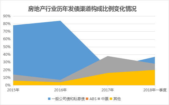 觀點指數(shù)監(jiān)測發(fā)現(xiàn),房地產(chǎn)行業(yè)的發(fā)債渠道也在發(fā)生改變。過往房企青睞的一般公司債以及私募債的比例在逐步下調(diào),具體表現(xiàn)為由2015年的占比78%下降至2018年一季度的37%。