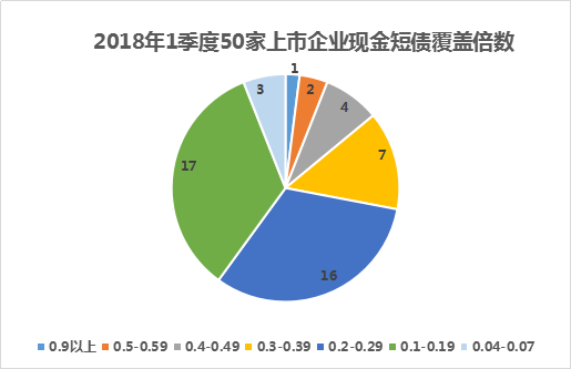 從個股來看,2018年一季度,現(xiàn)金短債覆蓋倍數(shù)最高的企業(yè)為0.91,僅有一家。接著出現(xiàn)斷層,現(xiàn)金短債覆蓋倍數(shù)第二以及第三高的企業(yè)為0.52和0.5。介于0.4-0.49之間的企業(yè)僅為4家,0.3-0.39的則為7家。