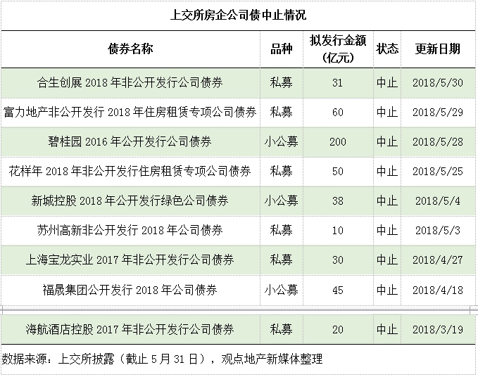 于是過(guò)去一星期內(nèi),除了發(fā)債規(guī)模龐大如碧桂園,包括花樣年、富力、合生創(chuàng)展在上交所申請(qǐng)公司債先后被中止,涉及總額度達(dá)341億元。時(shí)間最短的是合生創(chuàng)展,其公司債31億元才剛于5月22日獲得交易所受理。