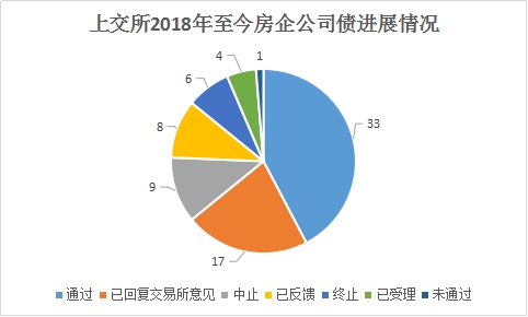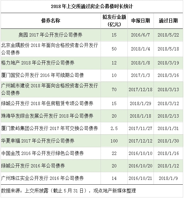 總體而言,從上交所審核的公司債情況看,2018年前五個(gè)月共有約78筆房企公司債在申請(qǐng)發(fā)行,其中通過(guò)的有33筆,占比不足一半;剩余暫未通過(guò)的有38筆,未通過(guò)或終止的有7筆,包括寶能旗下深業(yè)物流20億元小公募債。