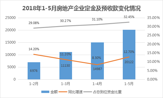 房企到位資金增速超過預(yù)期,主要個(gè)得益于銷售回款的加速。從數(shù)據(jù)端來看,2018年1-5月,定金及預(yù)收款為20122億元,在所有到位資金中占比最大,達(dá)到32.45%。同時(shí),增長(zhǎng)速度亦是最快的,達(dá)到12.7%。