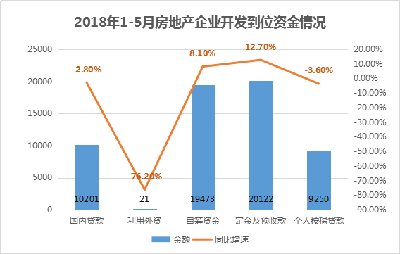 統(tǒng)計(jì)數(shù)據(jù)顯示,2018年1-5月,房企到位資金再次回升,達(dá)到62003億元,同比增長(zhǎng)5.1%,創(chuàng)下今年以來的新高,單月增速則達(dá)到17.4%。其中,國(guó)內(nèi)貸款下降2.8%,至10201億元;個(gè)人按揭貸款9250億元,下降3.6%;利用外資21億元,下降76.2%;自籌資金增長(zhǎng)處于第二高,為19473億元,增長(zhǎng)8.1%。