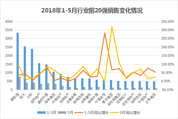 需要注意的是,5月的單月同比增速線基本走在1-5月增速的上方。其中,單月同比增速最高的是泰禾集團(tuán),5月合約銷售116億元,同比增速超過300%;1-5月合約銷售增長(zhǎng)最快的是金茂,合約銷售為567.95億元,同比增長(zhǎng)281.94%。