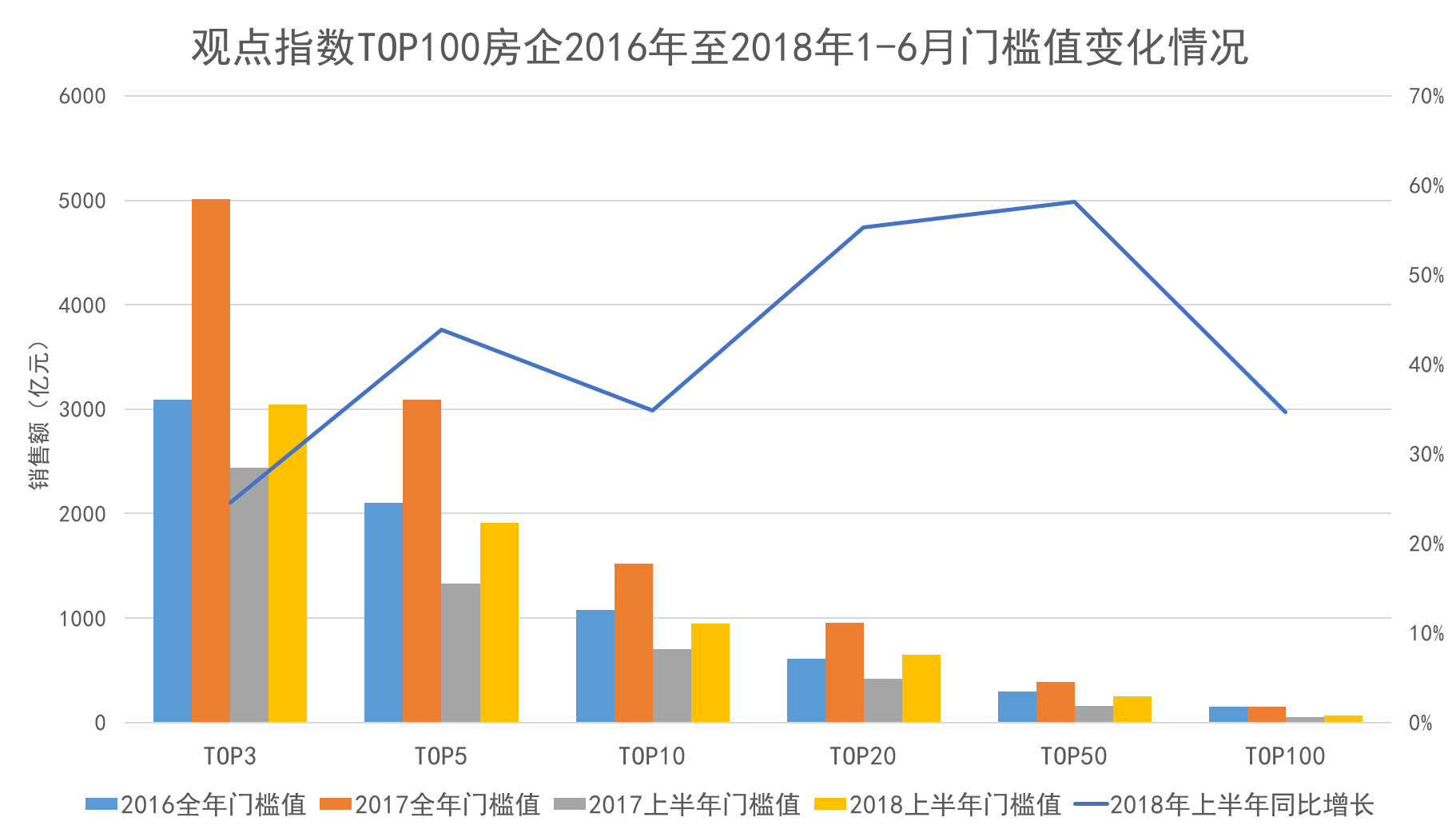 從“觀點(diǎn)指數(shù)·2018年上半年中國(guó)房地產(chǎn)企業(yè)銷售金額TOP100”來(lái)看,上半年各階梯門檻值均有不同程度上升,反映出不管是各路房企都在努力擴(kuò)大自己的銷售規(guī)模。