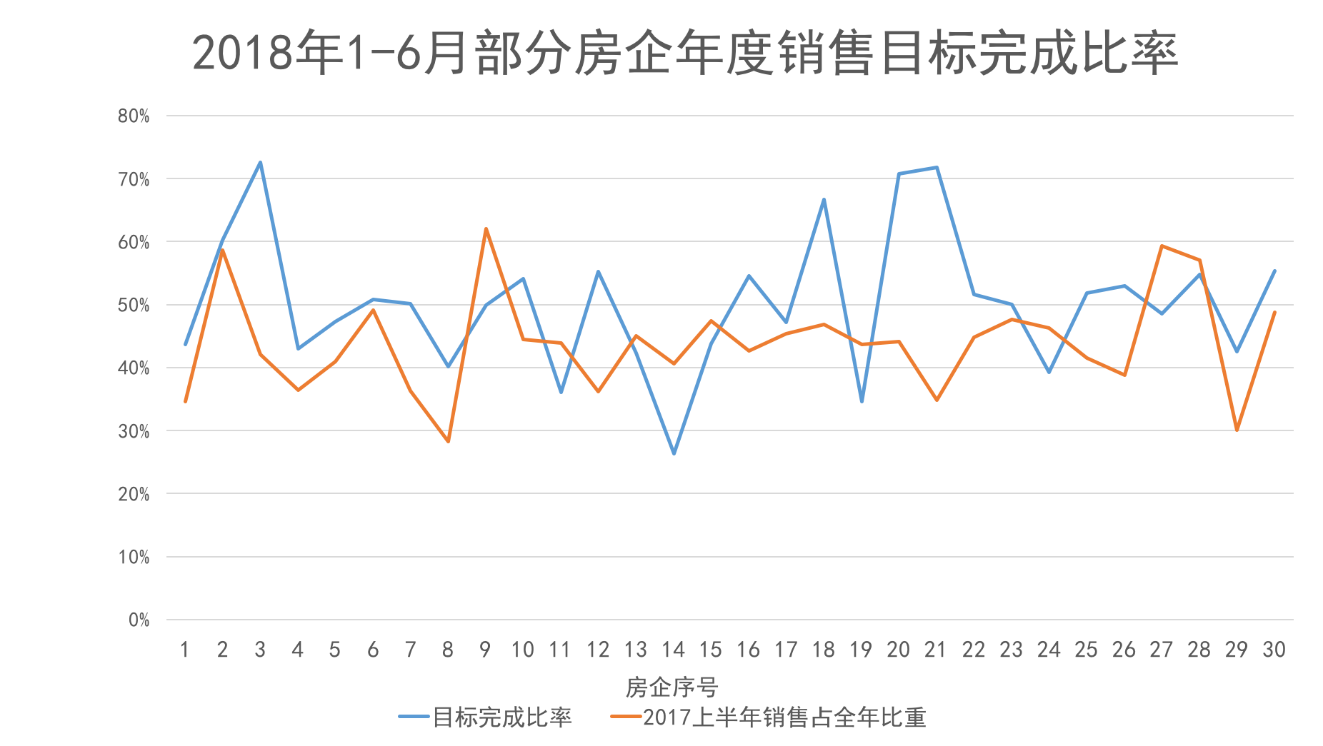 2018年伊始,就有不少房企設(shè)立全年銷售目標(biāo),從上半年的完成情況來(lái)看,雖然面臨很多困難,但是從完成比率來(lái)看,今年將是不少企業(yè)超常發(fā)揮的一年。觀點(diǎn)指數(shù)隨機(jī)抽取的30家樣本企業(yè)中,目標(biāo)完成率達(dá)到50%以上的房企數(shù)量最多,達(dá)到16家,占比53.33%;目標(biāo)完成率處于40%-50%之間的房企達(dá)到10家;目標(biāo)完成率低于30%的房企僅有一家。