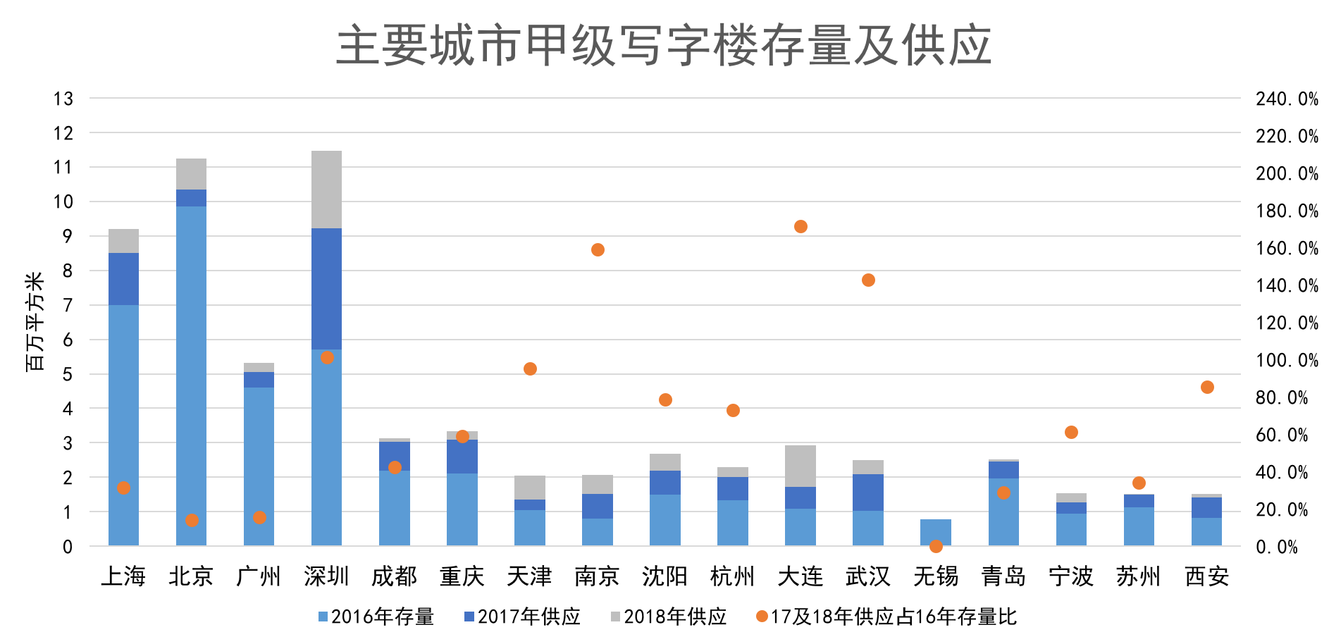 在甲級(jí)寫字樓供應(yīng)方面,除了個(gè)別二三線城市將保持較快增長(zhǎng)外,其他將維持緩慢增長(zhǎng)狀態(tài),特別是北上廣,由于市場(chǎng)發(fā)展較早,飽和程度較高,增長(zhǎng)速度極慢。