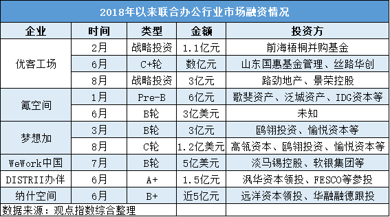 據(jù)觀點(diǎn)指數(shù)不完全統(tǒng)計,2018年以來,聯(lián)合辦公運(yùn)營商融資金額超過60多億元;但優(yōu)客工場所占的比例并不是很大。也許是意識到競爭的壓力,優(yōu)客工場于近日再次啟動了2億美元的D輪融資事宜;若加上該筆資金,今年所涉融資金額已達(dá)約20億元人民幣。