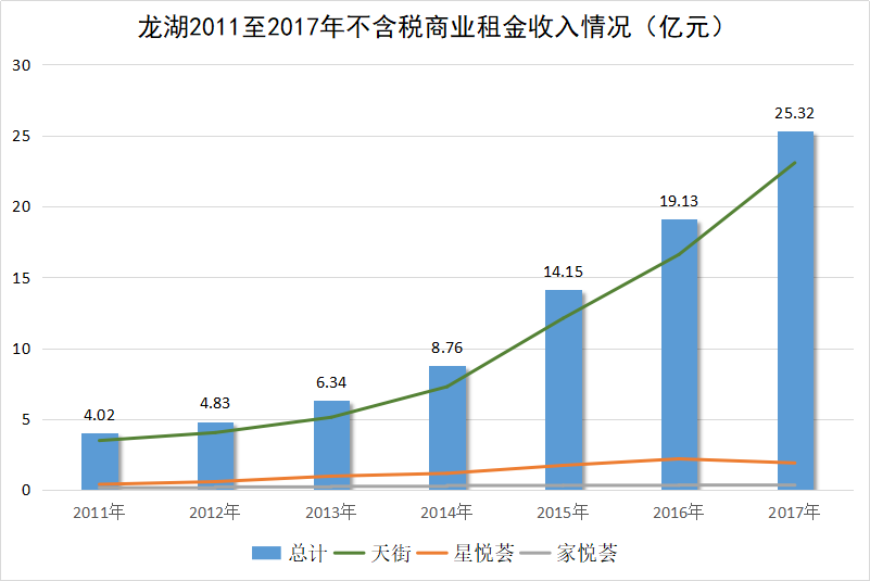 2011年,龍湖把商業(yè)提升至戰(zhàn)略層面;2012年,它明確地列出了商業(yè)項(xiàng)目的3條產(chǎn)品線:天街、星悅薈、家悅薈。此后,在2017年將長(zhǎng)租公寓列入投資物業(yè)范疇之前,其租金收入基本都來源于商場(chǎng)。