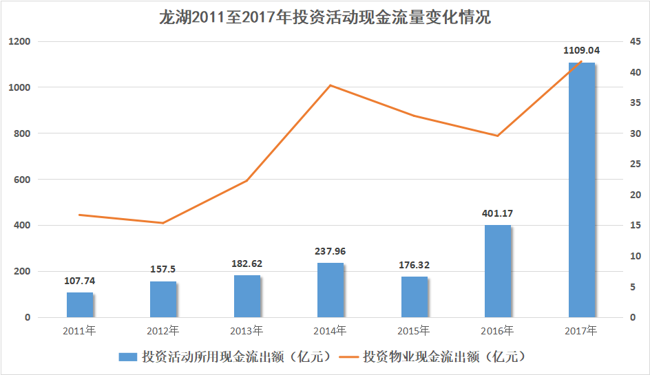 近幾年,龍湖投資活動(dòng)所用的現(xiàn)金流出額在波動(dòng)中呈增長(zhǎng)趨勢(shì);去年,龍湖以1.76倍的增長(zhǎng)幅度,將額度提升至1109.04億元。其中,它的投資物業(yè)現(xiàn)金流出額,在前三年連續(xù)下降的情況下,于2017年增長(zhǎng)41.06%至41.67億元;這或許與龍湖不斷加持商業(yè)與長(zhǎng)租公寓有關(guān)。