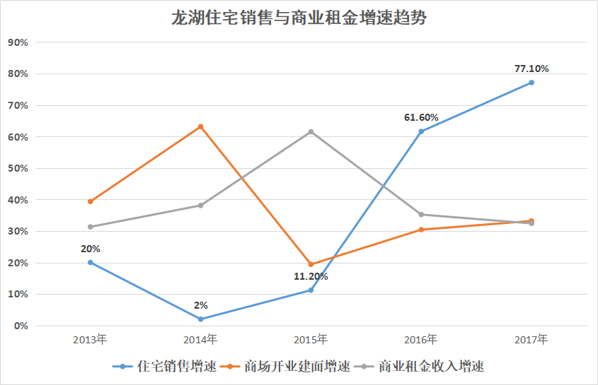2014年,龍湖住宅業(yè)務(wù)的銷售增速跌入谷底,只達(dá)到2%;但從2015年開始,它的增速就開始躥升,直到2017年達(dá)到77.1%。在此期間,盡管龍湖的商場(chǎng)開業(yè)建面、租金收入增速常有波動(dòng),但住宅業(yè)務(wù)一直保持著“領(lǐng)頭”的位置。