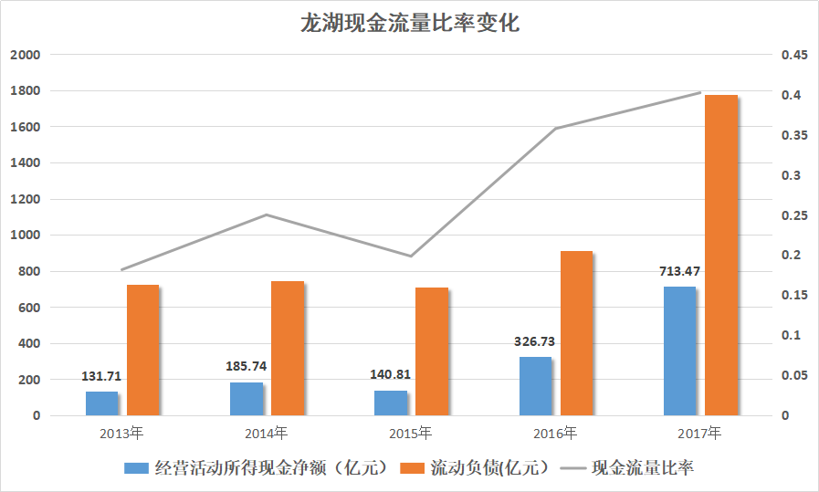 觀點(diǎn)指數(shù)通過計(jì)算比較發(fā)現(xiàn),龍湖的現(xiàn)金流量比率(經(jīng)營(yíng)活動(dòng)所得現(xiàn)金凈額/流動(dòng)負(fù)債)雖然偶有波動(dòng),但2017年仍然上升至0.4,其償債能力以及經(jīng)營(yíng)活動(dòng)的“造血”功能有逐漸改善的趨勢(shì)。