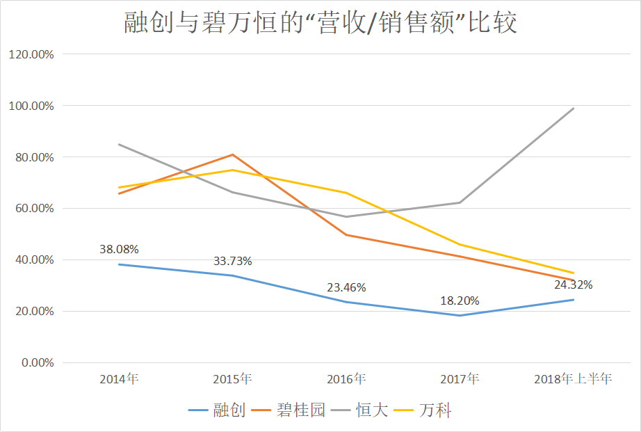 近兩年在融創(chuàng)銷售增速動輒達到一點幾倍的情況下,相對較低的營收銷售比體現(xiàn)了它結轉的“節(jié)制”。