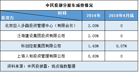 除了巨人網(wǎng)絡(luò)及泛海,據(jù)觀點(diǎn)指數(shù)不完全統(tǒng)計(jì),選擇減持或退出中民投的股東還包括早期被譽(yù)為重要股東之一的科創(chuàng)控股,以及上海人和投資。